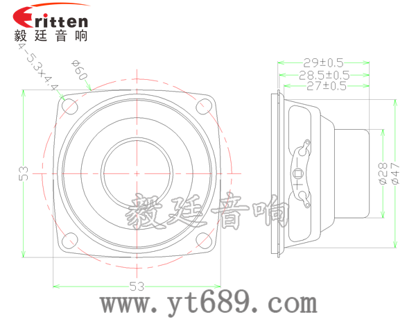 53mm方形鐵盆架內(nèi)磁全頻喇叭,散熱性能好,耐沖擊,保持音色清晰、完美。