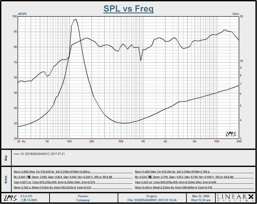 其低頻彈性非常好,下潛很深,中頻表現(xiàn)非常完美(平整走向),即使在大動態(tài)下也從容自如,在配合相等容積箱體時,低音非常的震撼,夠沉、夠力、速度快,中頻非常清晰悅耳。