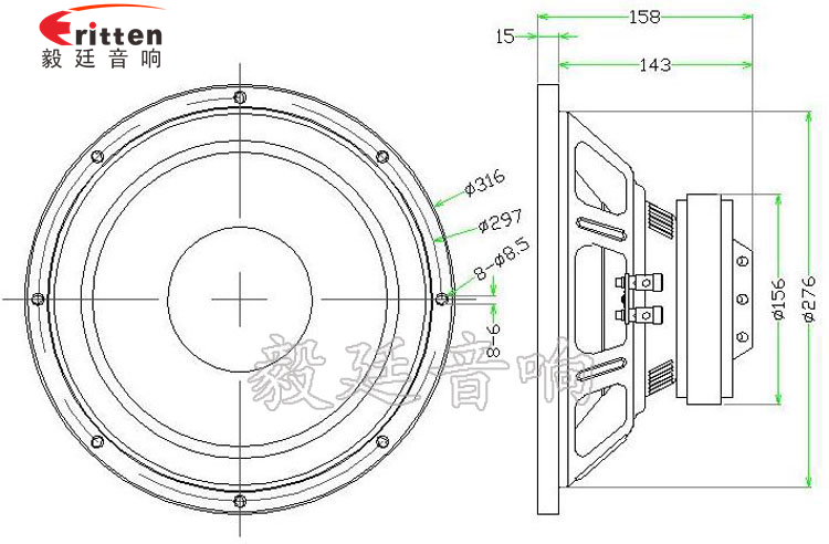 12寸圓型鐵盆架外磁重低音喇叭,采用的是高性能鐵氧體,音色清晰、低音震撼;