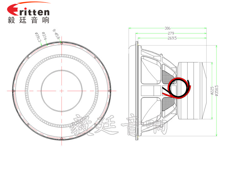 15寸圓形鑄鋁盆架重低音喇叭,采用了超大的磁體Φ225X25mm磁性強,給喇叭提供了飽滿的動力,低頻厚實;