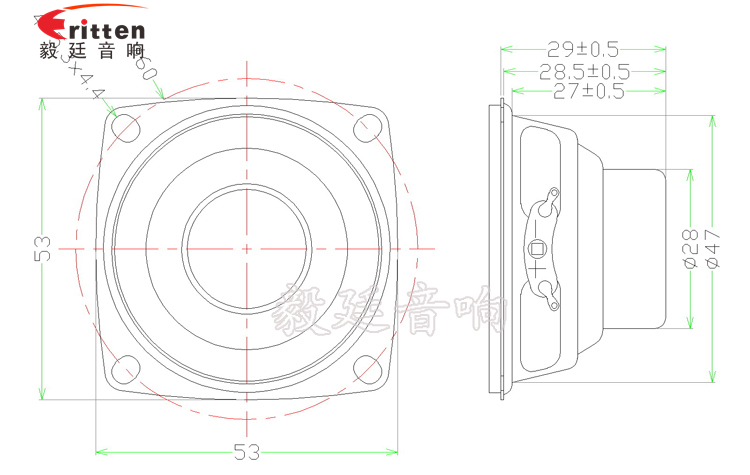 53mm方形鐵盆架內(nèi)磁全頻喇叭,鑄鐵盆架,用的是優(yōu)質(zhì)的材料一次成型,四個(gè)超大的散熱孔,散熱性能好,耐沖擊;