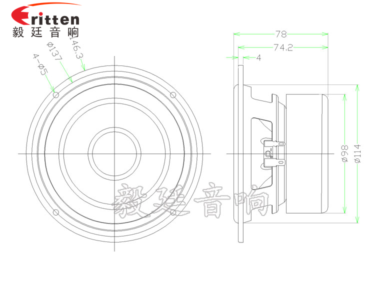 5.25寸圓形鐵盆架外磁防磁,采用雙磁鐵氧體,外加防磁罩,更好的保護(hù)了喇叭的磁性不外漏;