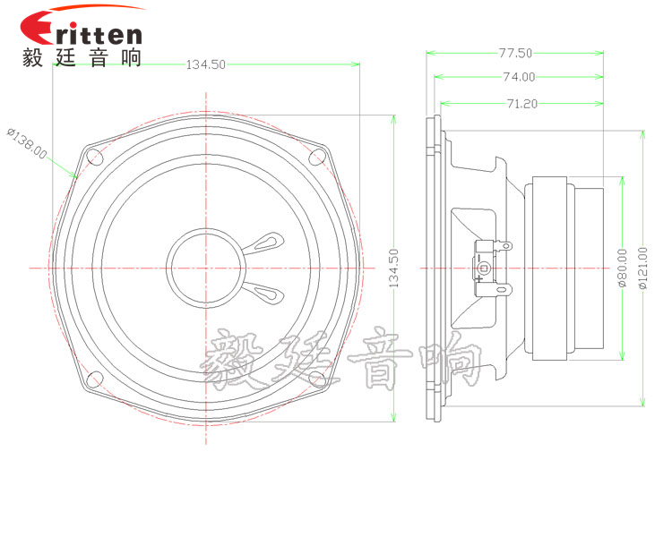 描述:蘋果型鐵盆架凸橡膠邊PP盆25芯外磁雙磁中低音4歐30WHIFI音箱喇叭;