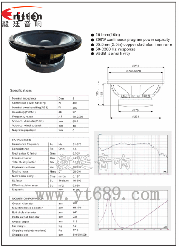 此款優(yōu)異用于10寸75芯200W重低音喇叭,舞臺音響,額定功率為200W,最大功率為400W,毅廷音響科技有限公司工程師研發(fā)出發(fā)燒者的喜愛揚聲器,值得選購;